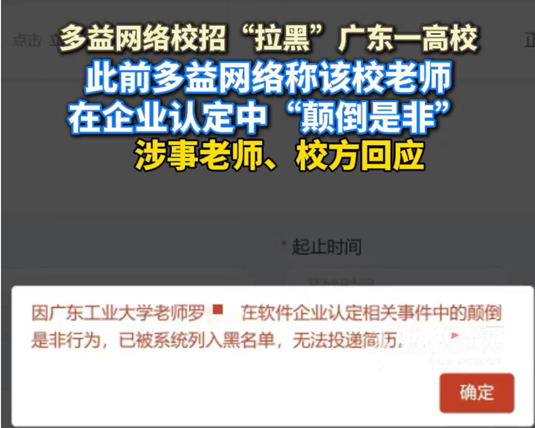 近日,多名广东工业大学应届毕业生反映,他们在向广州多益网络股份有限公司投递简历时被“拉黑”,同时系统弹出提示称,该校老师罗某某在软件企业认定事件中颠倒是非,已被系统列入黑名单,无法投递简历。