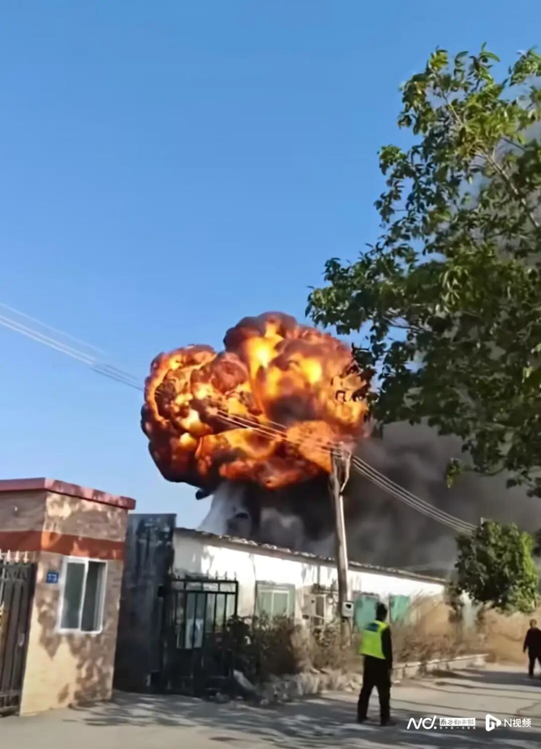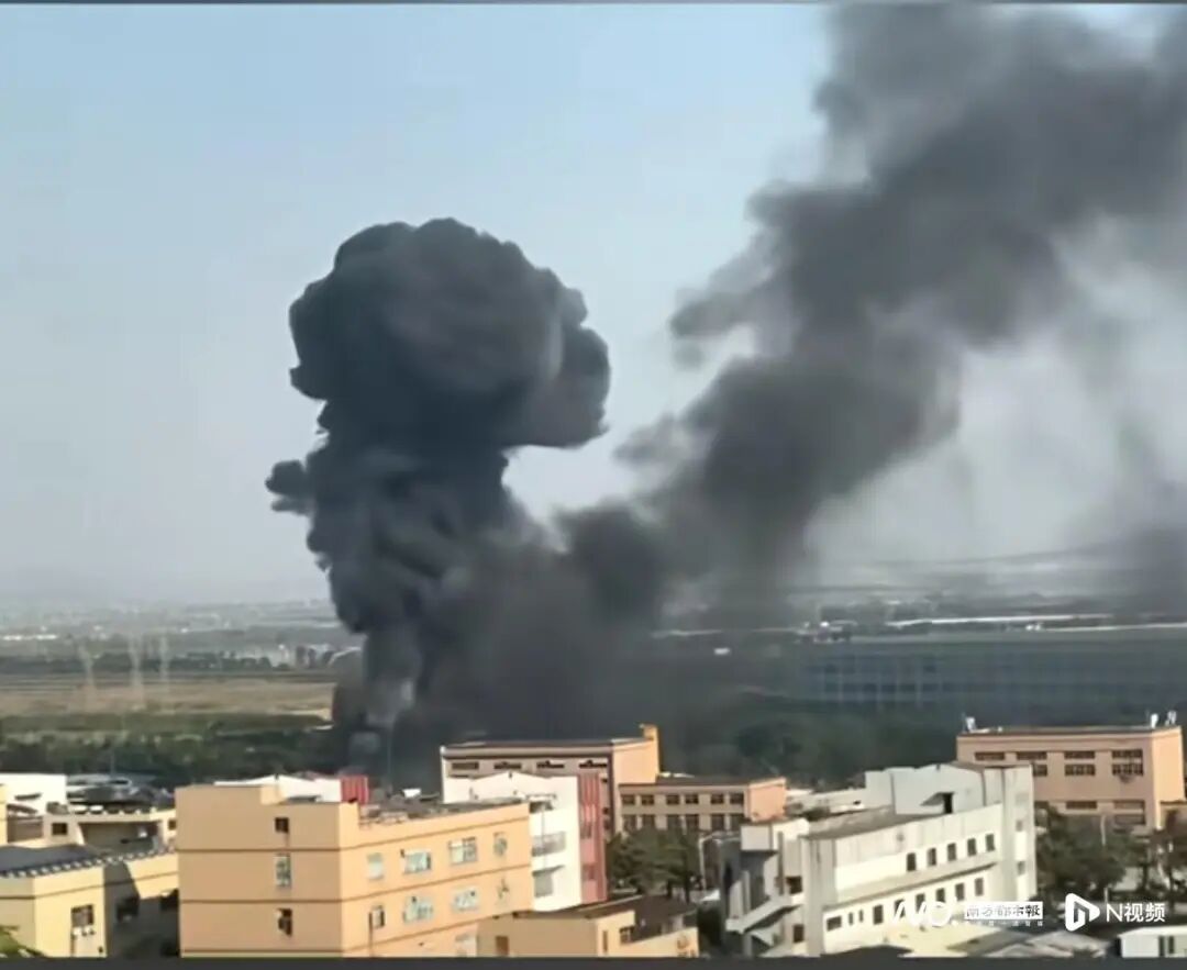 视频中,一片建筑物的后方,呈黑色的浓烟滚滚上升,并突然冒出巨大火团。现场有身穿浅绿色背心的人员走动,似在查看火情。