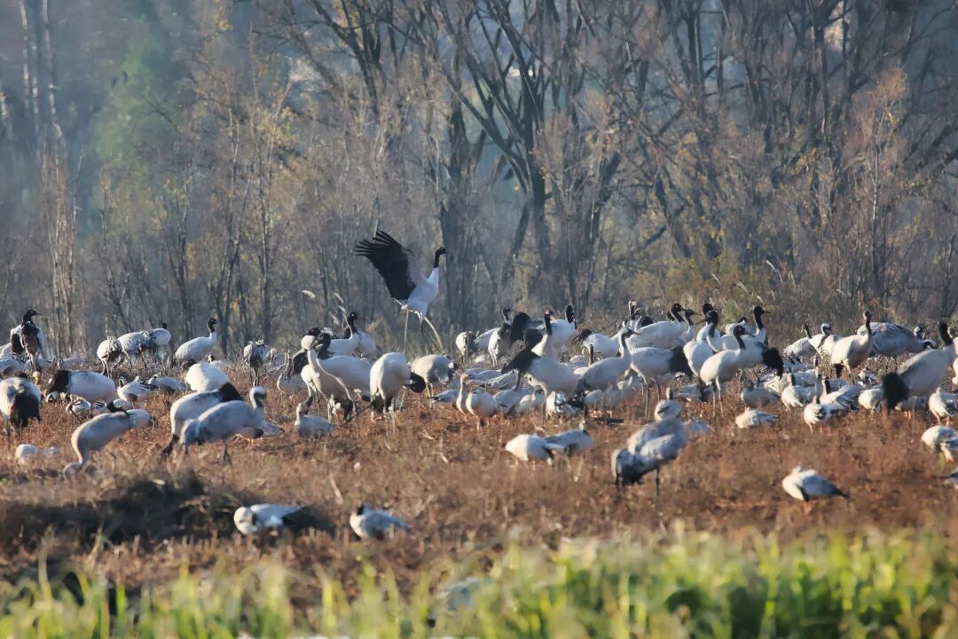 近日,位于云南曲靖的会泽黑颈鹤国家级自然保护区迎来越冬候鸟迁徙高峰期。成群的黑颈鹤、灰鹤在长海子、念湖等湿地栖息觅食,与远山近水相映成趣,构成一幅生动和谐的生态画卷。黑颈鹤是国家一级重点保护野生动物,云贵高原是它们的主要越冬地。每年10月,包含黑颈鹤在内的越冬候鸟就会来到保护区,直至次年3月底迁徙离开。保护区管护局局长肖良开介绍,长期以来,这里形成了黑颈鹤依赖传统农耕生产的独特人文生态景观,人鹤伴生已是这里的代名词。
