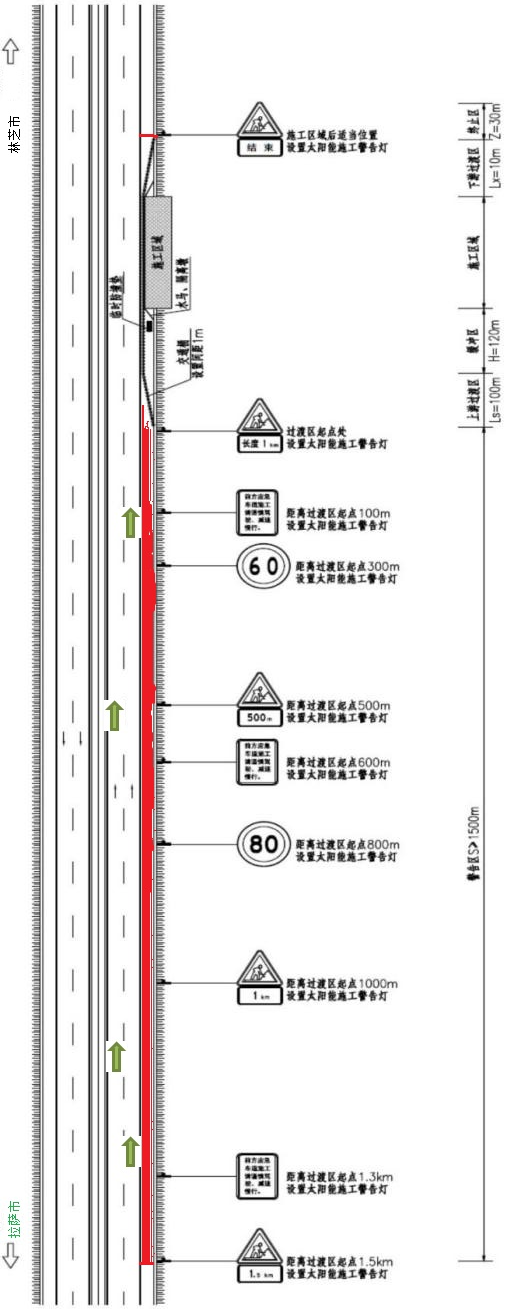 1. 施工区域车辆单向三车道通行,本次施工拟采用外侧车道(紧急停车道)封闭施工作业布控。施工区域路段限速60公里/小时,施工区域前后100米范围内设置提示标志牌引导车辆行驶,并设置明显的施工标志、警示灯、反光锥、围挡等。