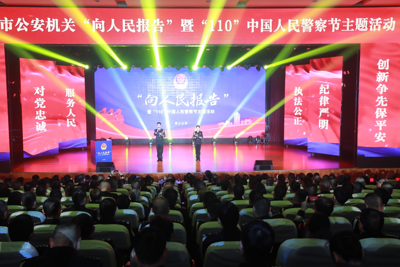 1月9日,在第六个中国人民警察节到来之际,眉山市公安局举行“向人民报告”暨中国人民警察节主题活动。活动通过民警故事分享、工作成果展示、文艺节目汇演等形式,回顾2025年眉山公安工作成效,向全市人民交出护航平安、服务发展的答卷。