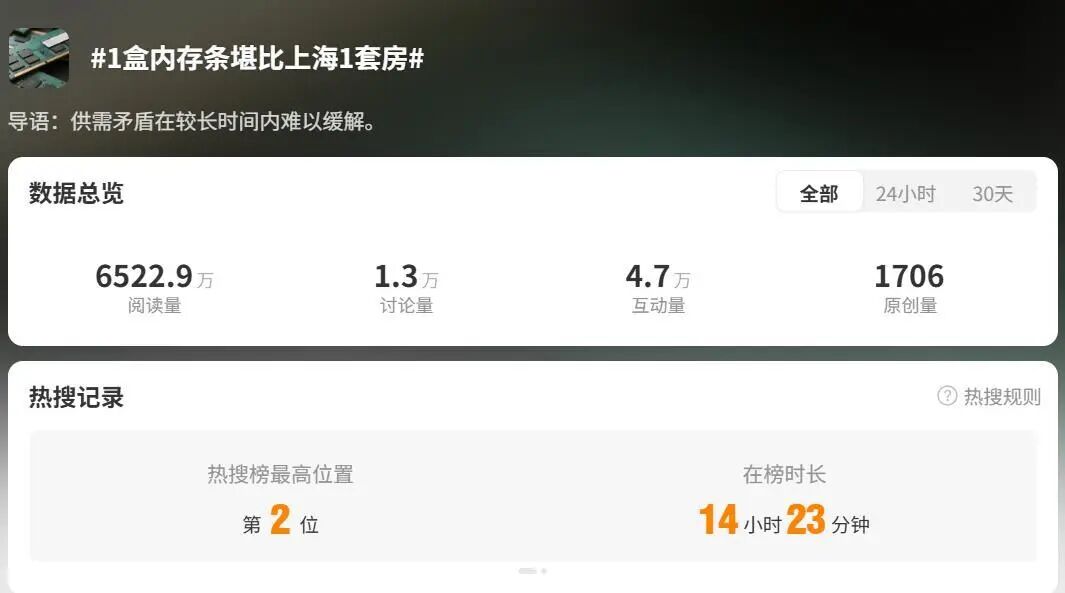 1月6日晚,话题“一盒内存条堪比上海一套房”,登上微博热搜榜第2位,阅读量达到6522.9万。