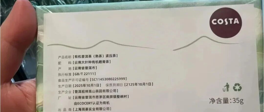 近日,有消费者向反映,其在电商平台购买的COSTA有机普洱茶(熟茶)紧压茶产品盒包装显示,该款产品的生产日期为2025年10月1日,保质到期日为2125年10月1日,保质期长达100年。