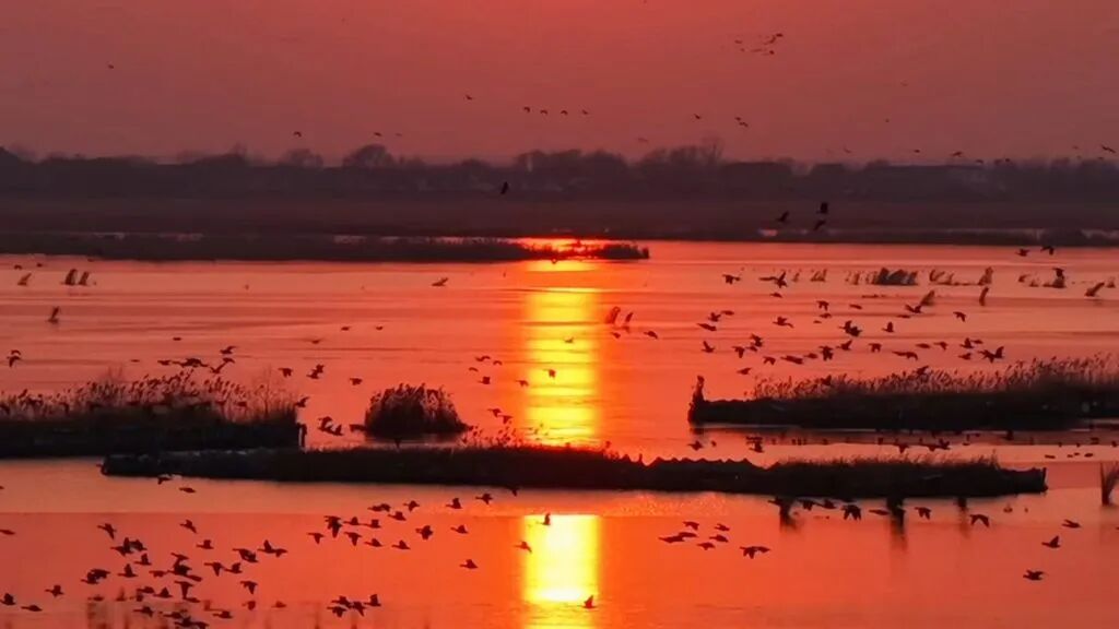 衡水湖畔霞光浸染,层层鸟浪翻涌成一幅流动画卷,诗意景致跃然眼前。详情→