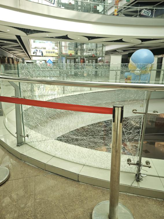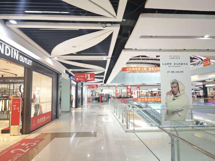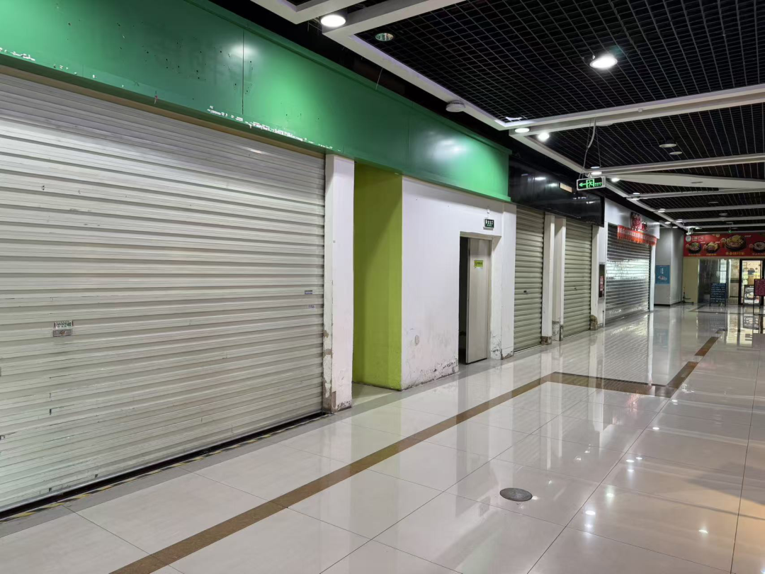 进入旁边的大型商场后,反差更加明显。一至三层仍有不少商户正常经营,货架上摆满各类商品,但商场四五层则呈现大面积空置状态。记者逐层探访发现,四五层的商铺大多大门紧锁,玻璃门贴上了褪色的招商广告,门口残留着废弃纸箱和杂物。同时,设施老化的痕迹随处可见:多处地砖出现裂缝、边角破损,中间的玻璃围挡有明显裂痕,未及时更换修补,存在不小的安全隐患。