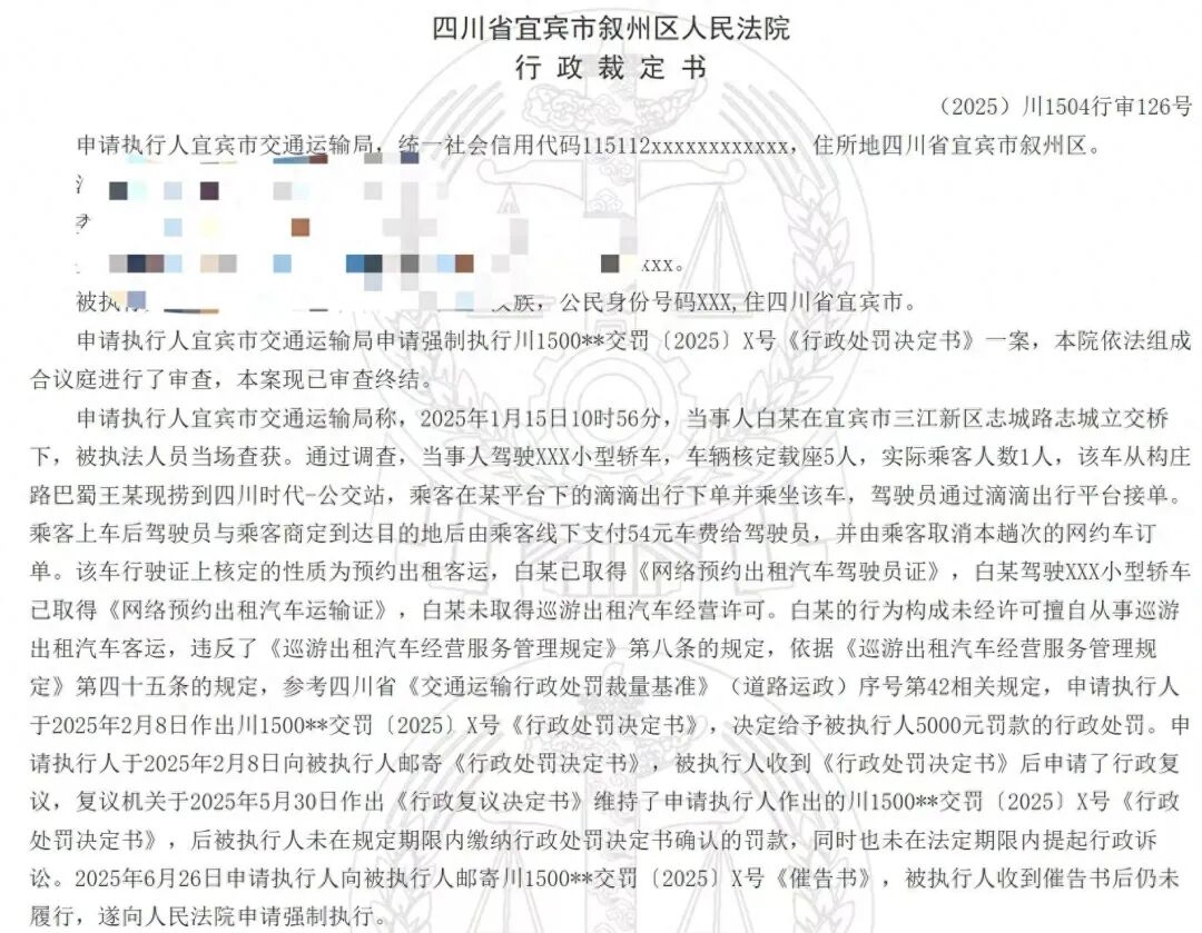 法院行政裁定书显示,2025年1月15日10时56分,当事人白某驾驶小型轿车,在宜宾市三江新区志城路志城立交桥下,被执法人员当场查获。调查显示,白某通过某出行平台接单,乘客上车后其与乘客商定到达目的地后由乘客线下支付54元车费,并由乘客取消本趟次的网约车订单。