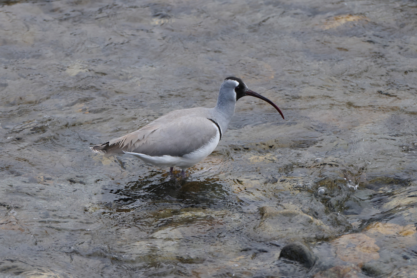 辨识要点:体羽以灰、黑、白为主,具标志性红色长嘴,嘴端下弯,眼周有裸皮。