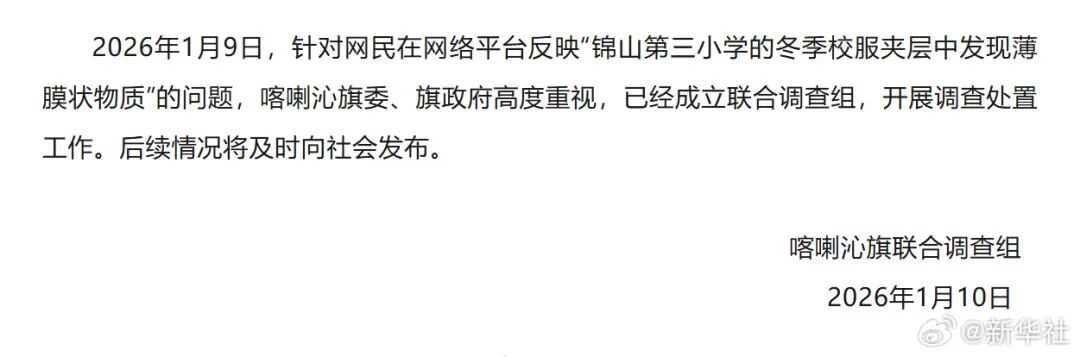 2026年1月9日,针对网民在网络平台反映“锦山第三小学的冬季校服夹层中发现薄膜状物质”的问题,喀喇沁旗委、旗政府高度重视,已经成立联合调查组,开展调查处置工作。后续情况将及时向社会发布。