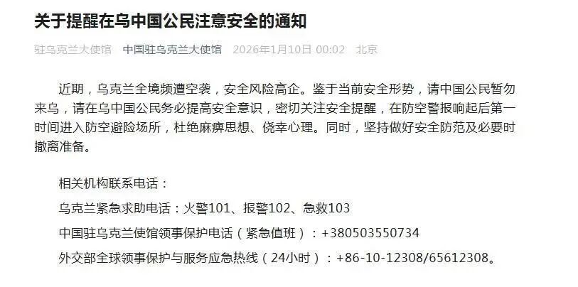 中国驻乌克兰大使馆10日发布通知: