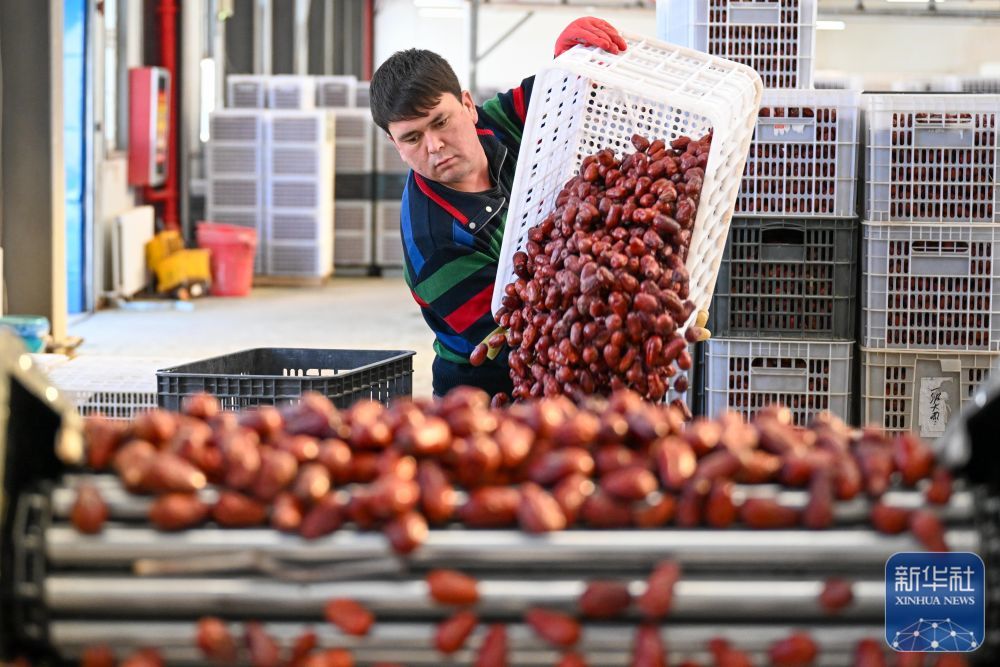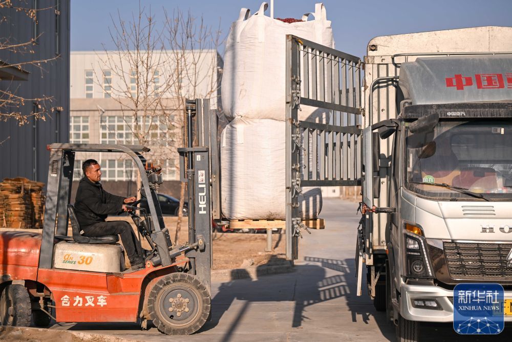 ↑ 在新疆和田地区墨玉县,和田源疆食品有限公司的工作人员在运送红枣(1月9日摄)。