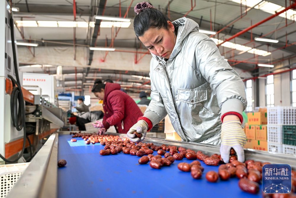 ↑ 在新疆和田地区墨玉县,和田源疆食品有限公司的工作人员在流水线上筛选红枣(1月9日摄)。
