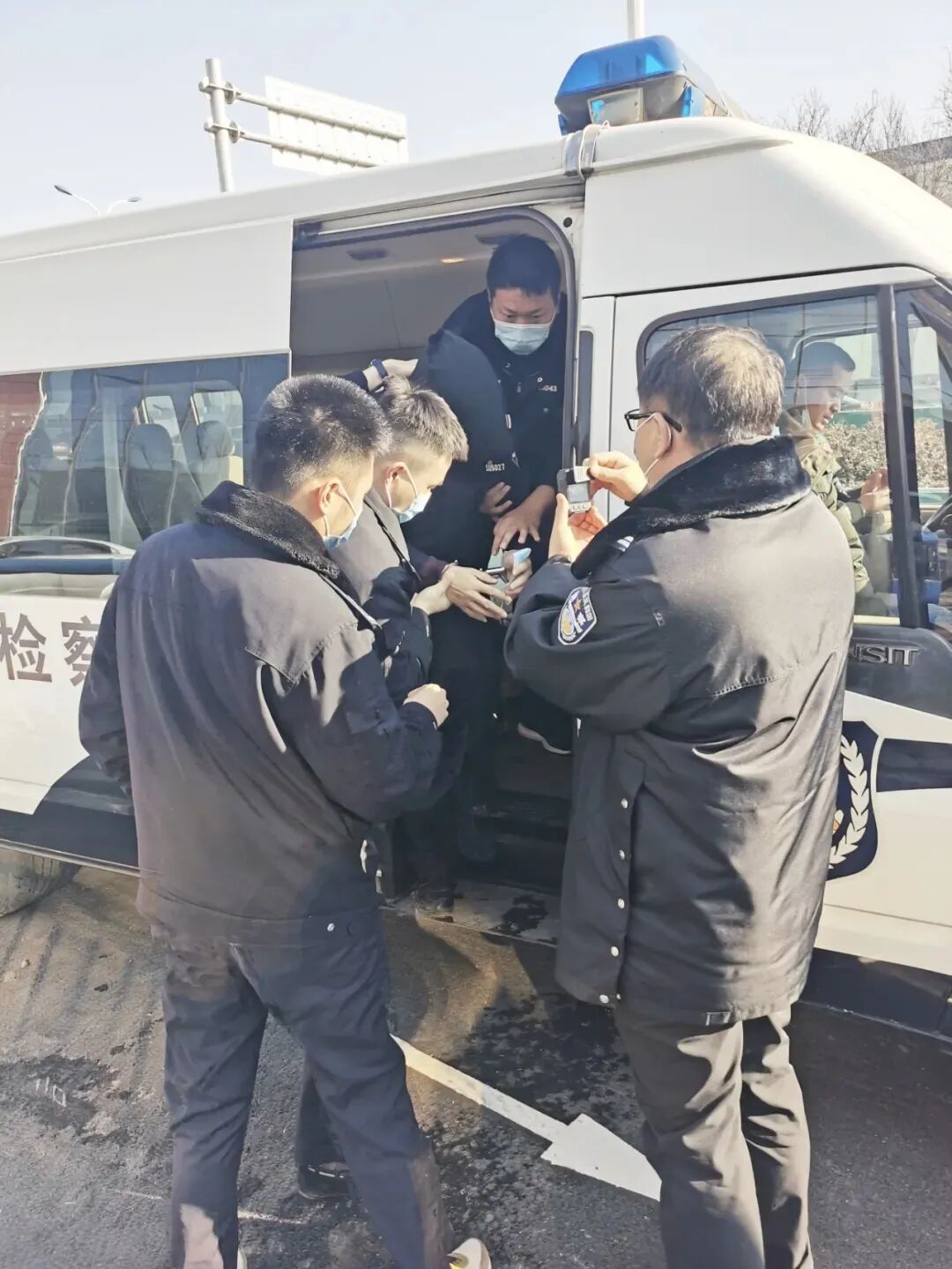 图⑤:近日,河北省保定市检察院司法警察支队执行押解任务,将犯罪嫌疑人押解上车,并全程使用执法记录仪录音录像。