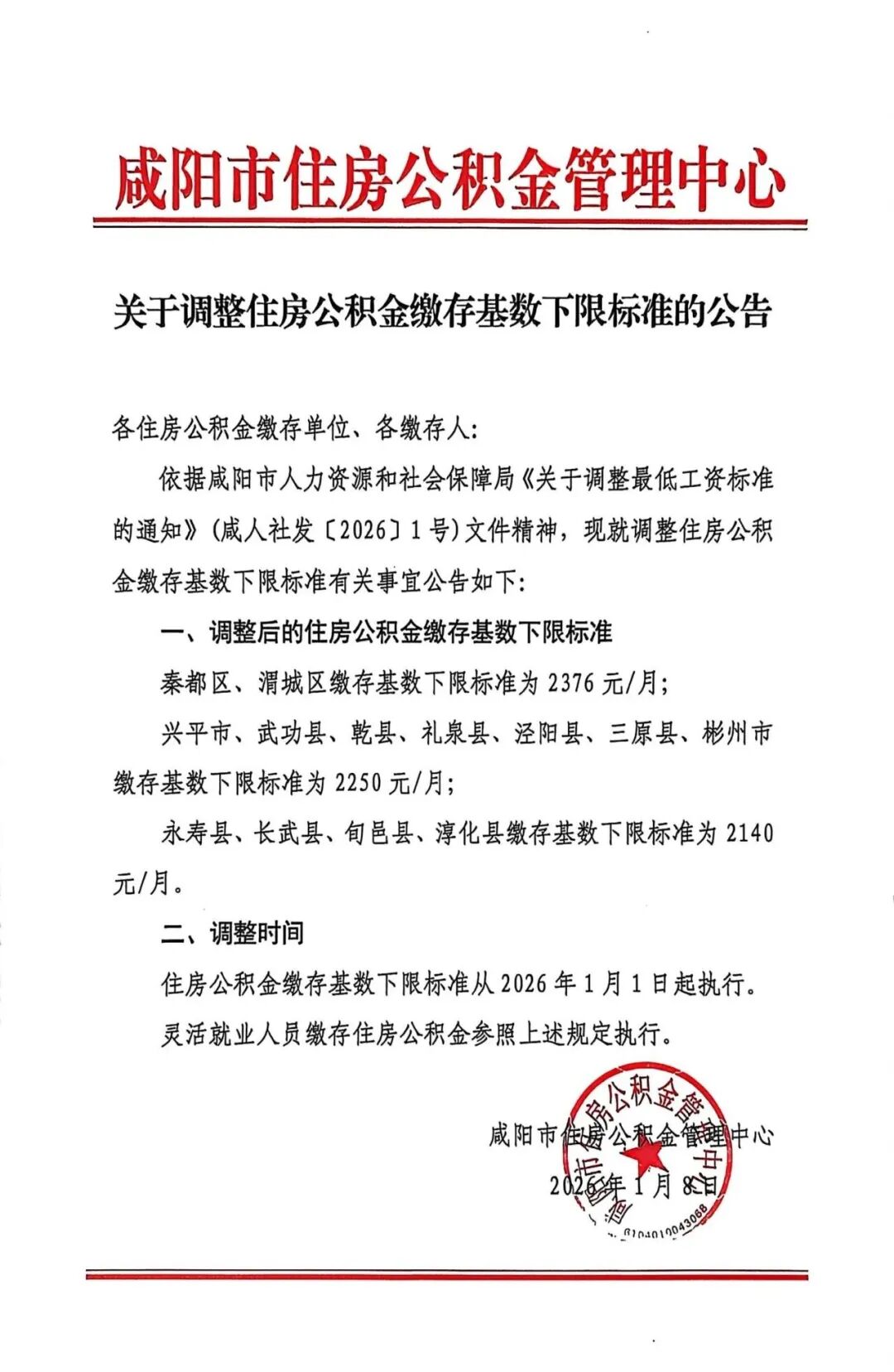 依据咸阳市人力资源和社会保障局《关于调整最低工资标准的通知》(咸人社发〔2026〕1号)文件精神,现就调整住房公积金缴存基数下限标准有关事宜公告如下: