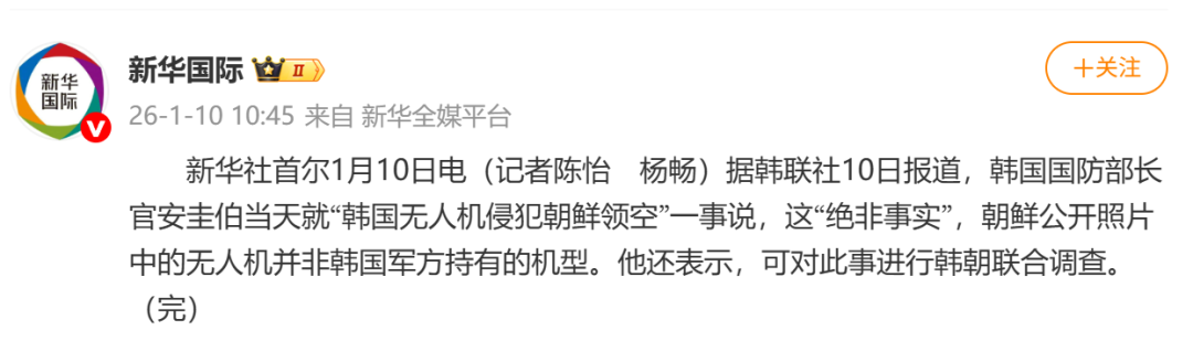 据朝中社10日报道,朝鲜人民军总参谋部发言人9日发表声明说,继2024年10月制造平壤上空无人机入侵事件后,韩国在新年伊始放飞无人机侵犯朝鲜领空,再次进行严重挑衅。