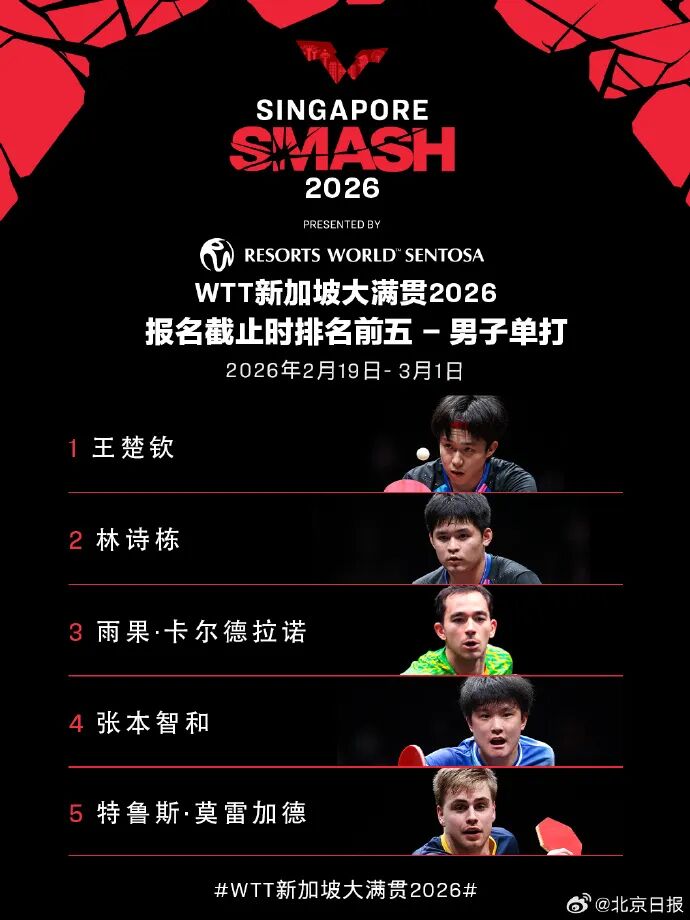 北京日报1月10日报道,WTT新加坡大满贯2026由新加坡圣淘沙名胜世界呈献,将于2026年2月19日至3月1日在新加坡体育中心举行。届时世界顶尖运动员将齐聚狮城,共同争夺2000点世界排名积分。