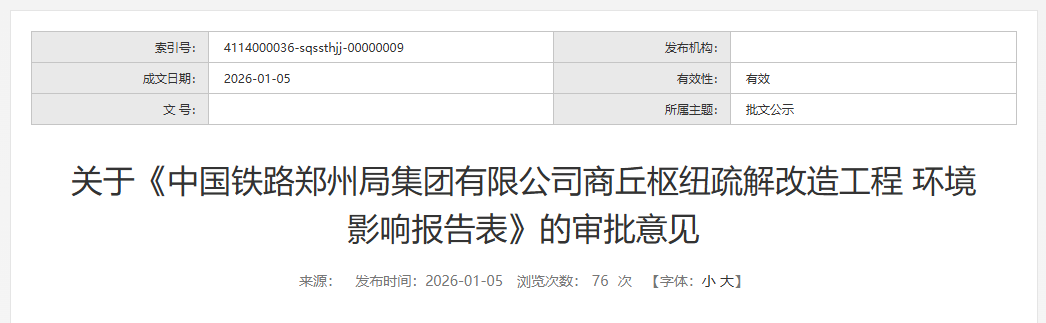 1月5日,商丘市生态环境局发布了关于《中国铁路郑州局集团有限公司商丘枢纽疏解改造工程环境影响报告表》的审批意见,项目环评正式获批。