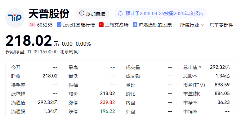 盘面上,天普股份自2025年12月31日起停牌,为近四个月第五次停牌核查。2025年,公司股价从年初每股12.59元涨至年末的218.02元,累计涨幅达1631.7%,被市场称为“16倍大牛股”,目前公司市值292.3亿元。