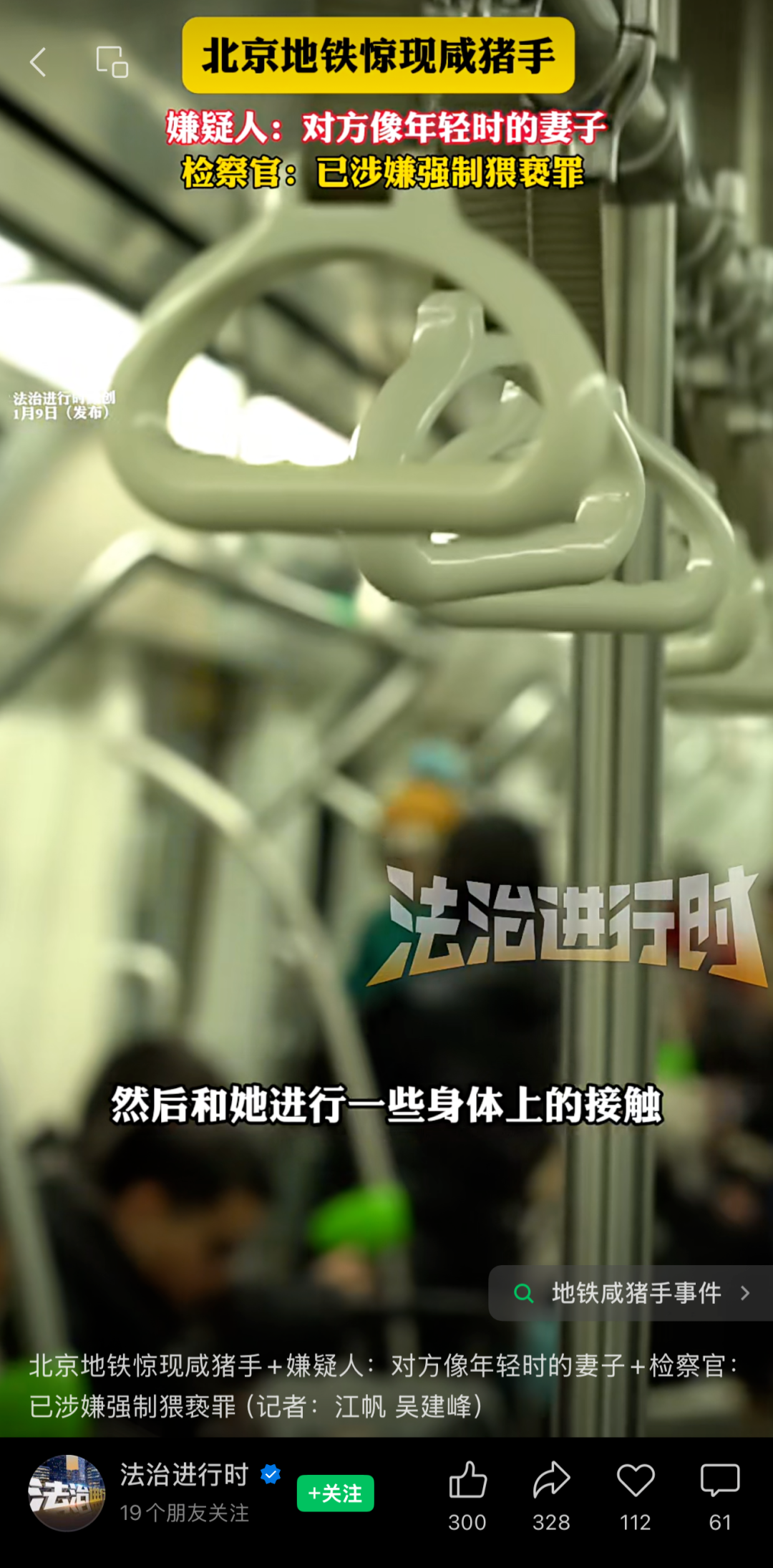 1月9日,@法治进行时 披露了一起发生在北京地铁里的“咸猪手”事件。