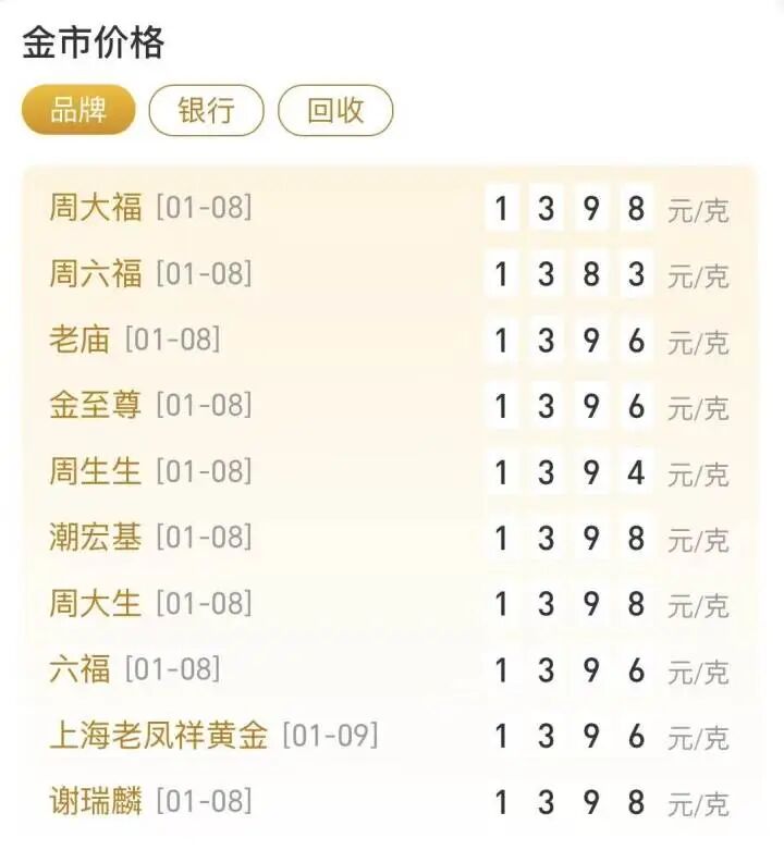 近日,各大金饰品牌的实时报价再次接近1400元/克。比如周大福、潮宏基、周大生、谢瑞麟的报价为1398元/克。其他品牌报价从1383元/克至1396元/克不等。
