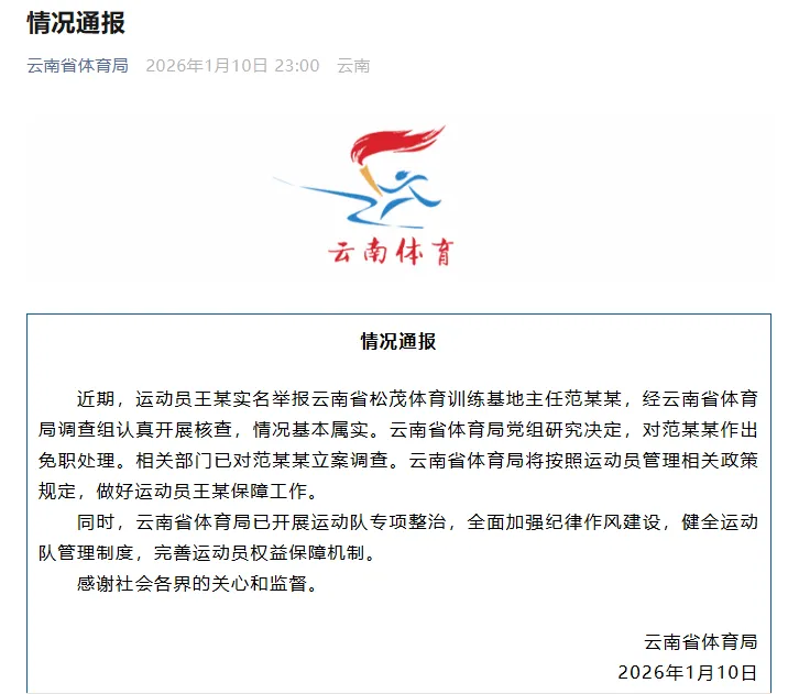 2026年1月10日晚,云南省体育局发布情况通报称,举报情况基本属实,决定免去范某某职务。相关部门已对范某某立案调查。