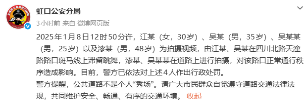 2026年1月8日12时50分许,江某(女,30岁)、吴某(男,35岁)、吴某某(男,25岁)以及漆某(男,48岁)为拍摄视频,由江某、吴某在四川北路天潼路路口斑马线上滞留跳舞,漆某、吴某某在道路上进行拍摄,对该路口正常通行秩序造成影响。目前,警方已依法对上述4人作出行政处罚。