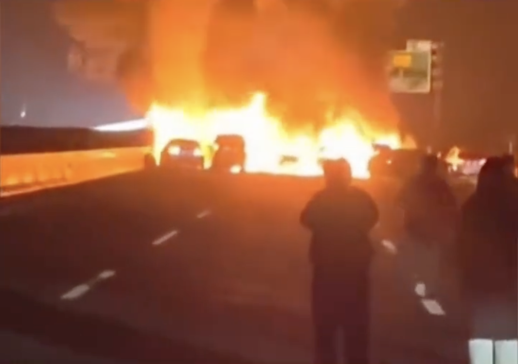 经初步调查,事故系一辆轻型仓栅式货车(装载烟花爆竹)侧翻后,后方3辆小型客车避让不及相继与货车发生追尾碰撞,造成车辆起火燃烧,飞溅火花引燃停在后方的8台小车。