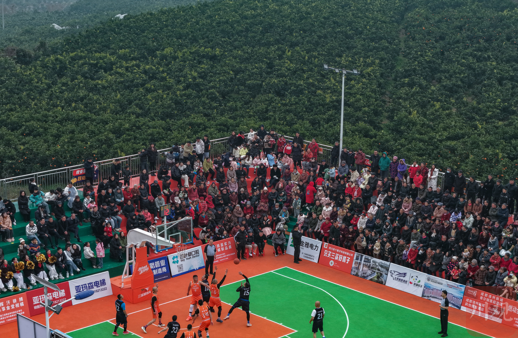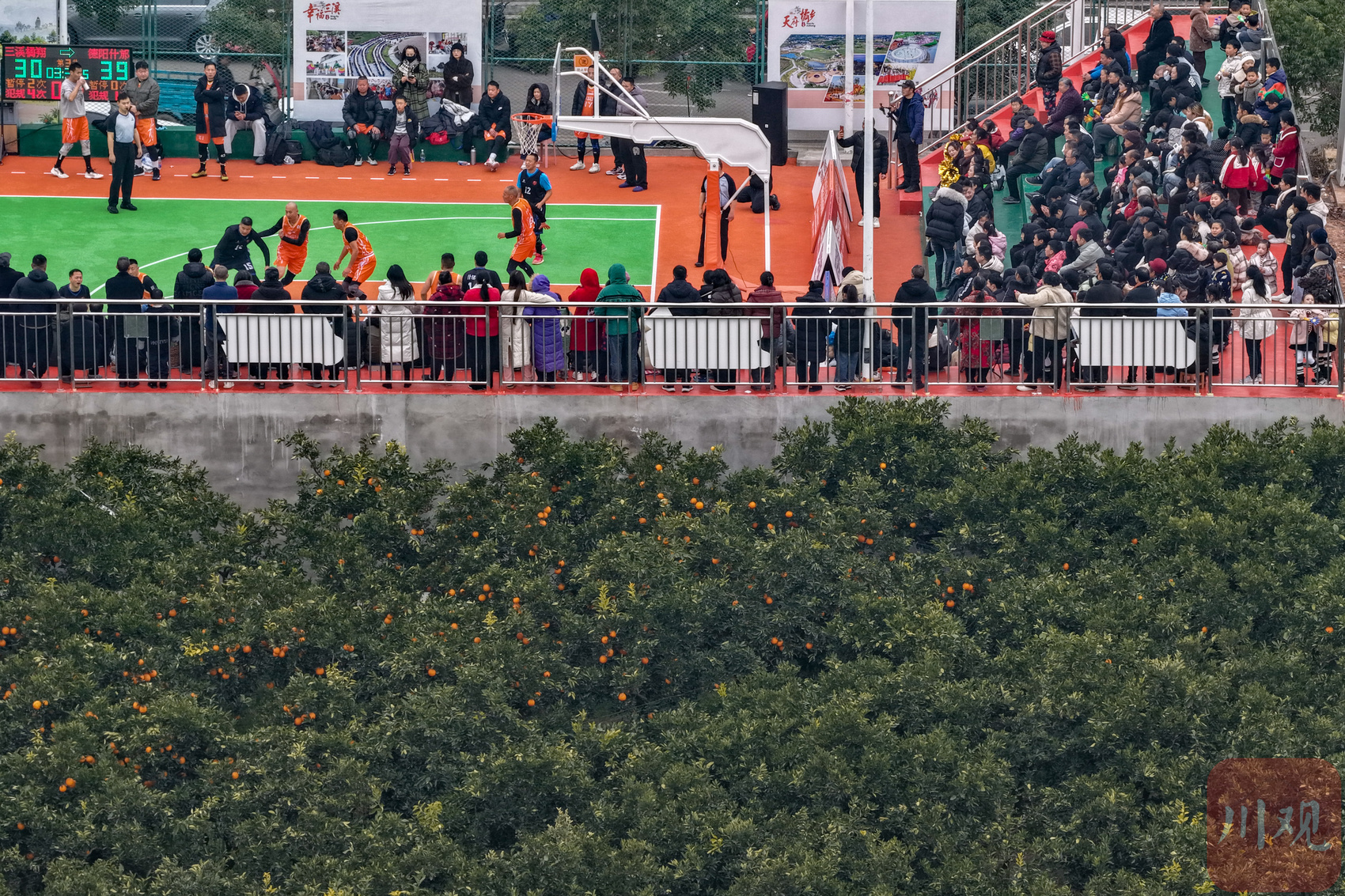 1月11日,成都金堂三溪镇举行“橙BA”篮球赛,赛场旁是当地大面积种植的柑橘树。