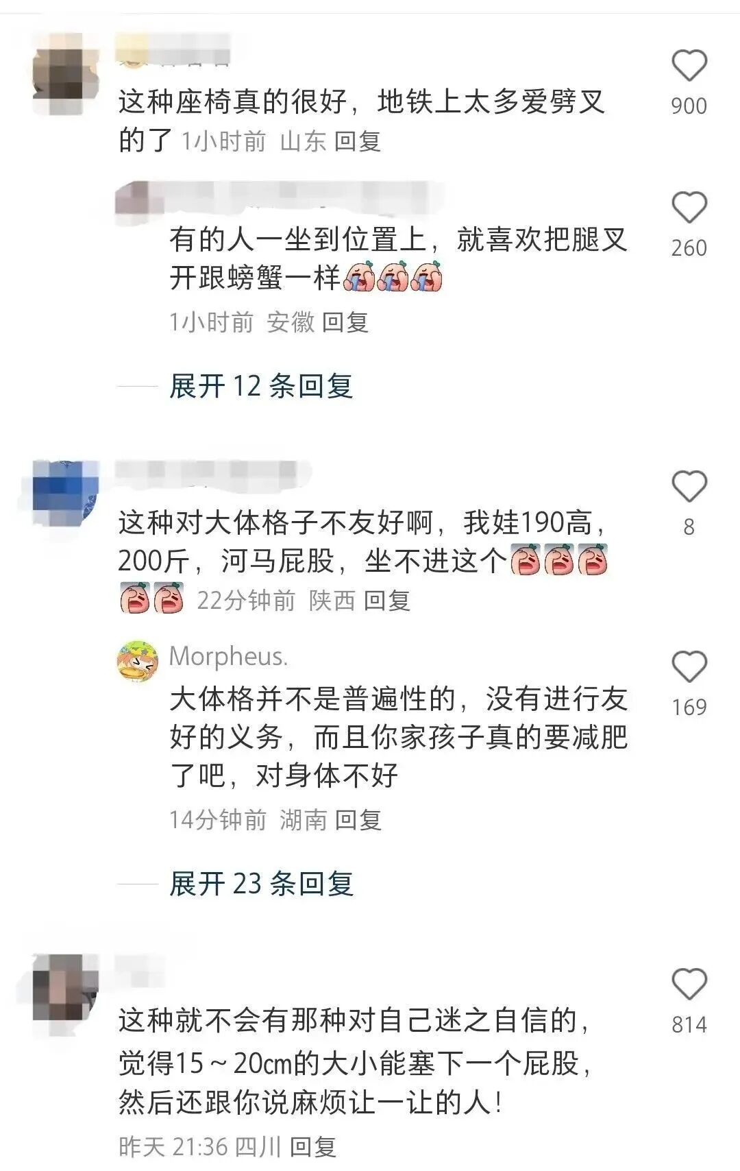 有网友在帖文中附上扶手座椅的图片,并直言“这种座椅太好了”。跟帖中,多数意见认为,与传统长条座椅相比,扶手座椅明确了个人空间,避免了“劈叉”坐、横躺占座等情况,能保障更多乘客的权益。也有身材瘦小的网友表示,自己终于能“坐满一个座位”了。不过,也有担忧的声音指出,需防止儿童坐在扶手上,以免急刹时发生危险。