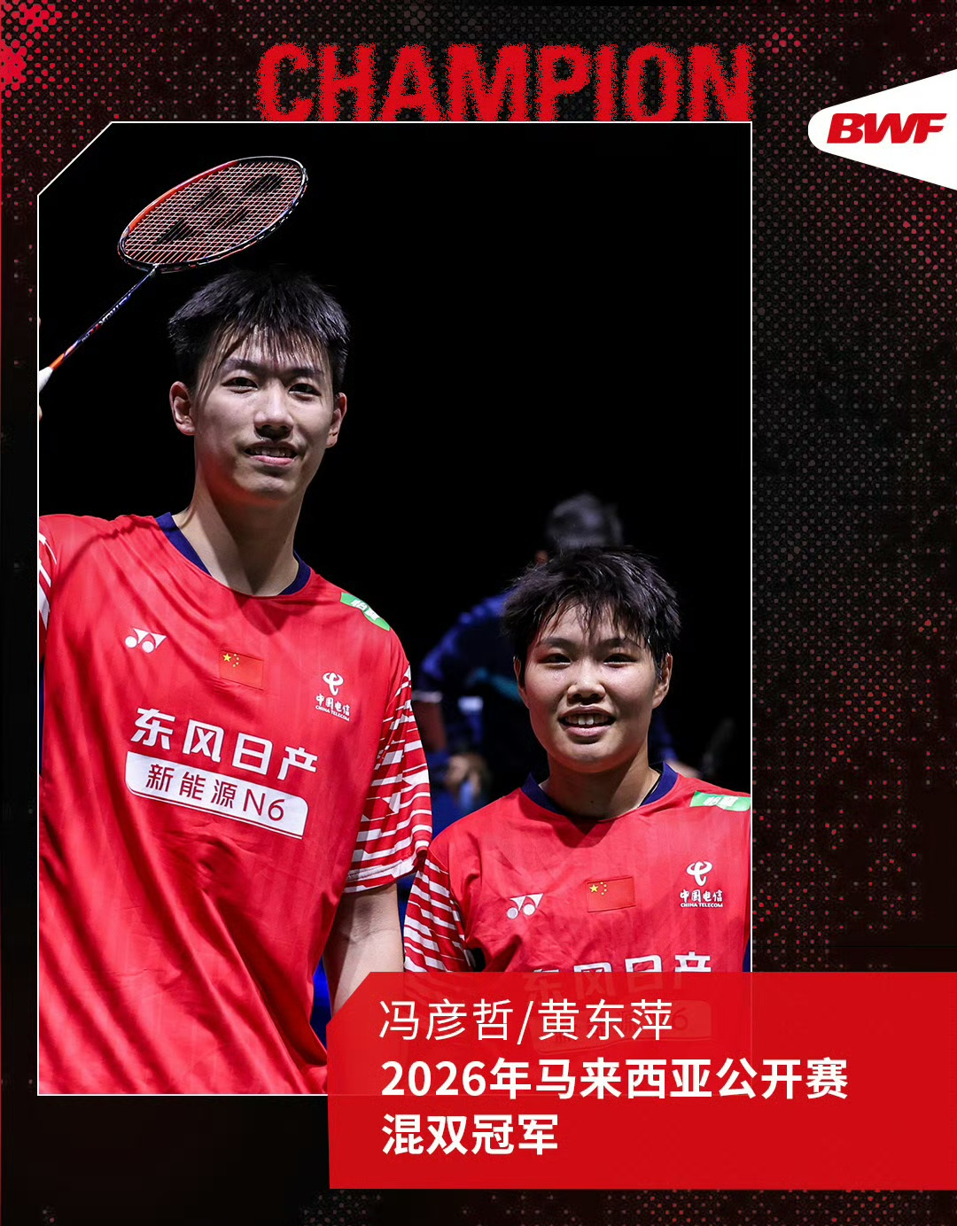 1月11日,在吉隆坡进行的2026年马来西亚羽毛球公开赛混双决赛中,中国队组合冯彦哲/黄东萍以总比分2:0战胜队友组合蒋振邦/魏雅欣,获得冠军。中国羽毛球队包揽本站赛事混双项目冠亚军。