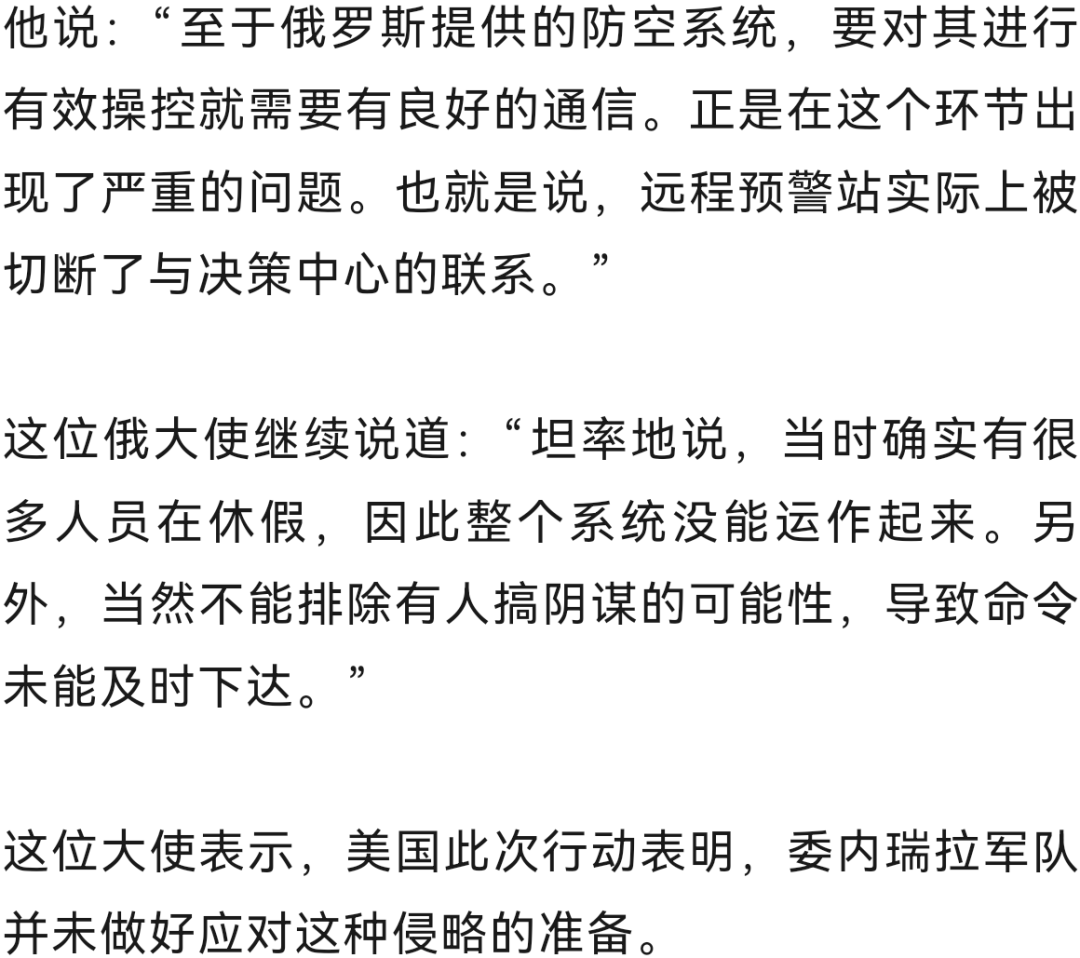 梅利克-巴格达萨罗夫说,美军发动袭击时,委内瑞拉防空系统的远程预警站通信出了问题,“被切断了与决策中心的联系”。