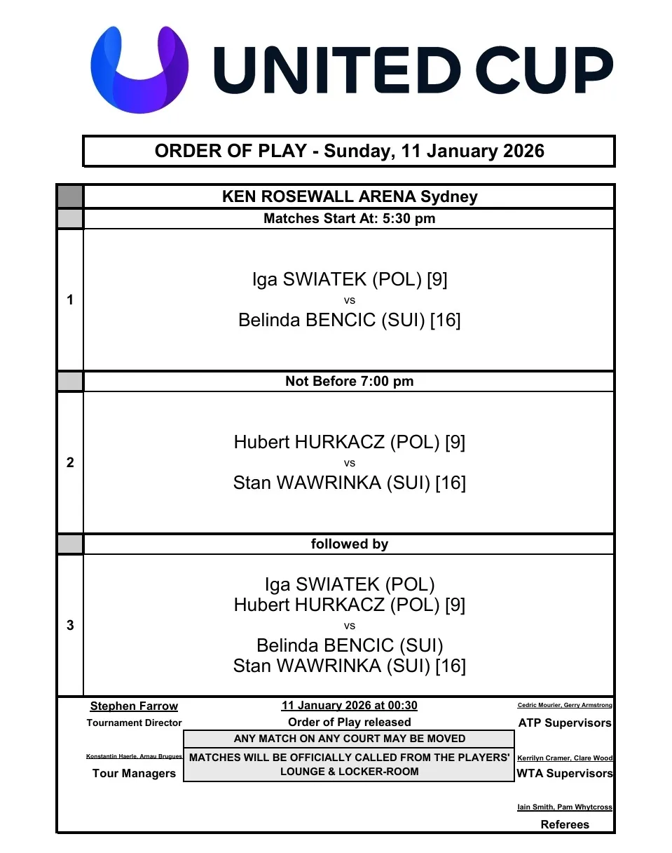 此外,今天还有另外两场赛事的决赛将开打。联合杯波兰瑞士上演强强对话,布里斯班站萨巴伦卡力争卫冕。