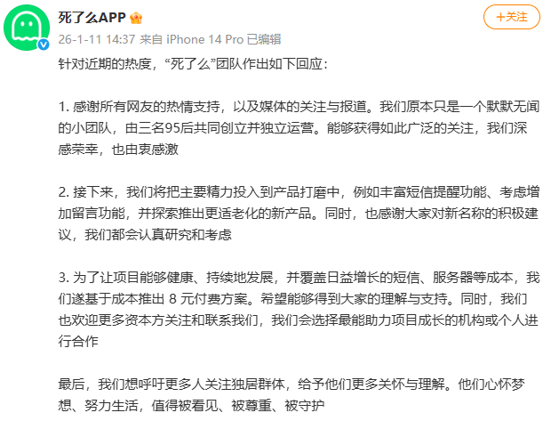 1. 感谢所有网友的热情支持,以及媒体的关注与报道。我们原本只是一个默默无闻的小团队,由三名95后共同创立并独立运营。能够获得如此广泛的关注,我们深感荣幸,也由衷感激