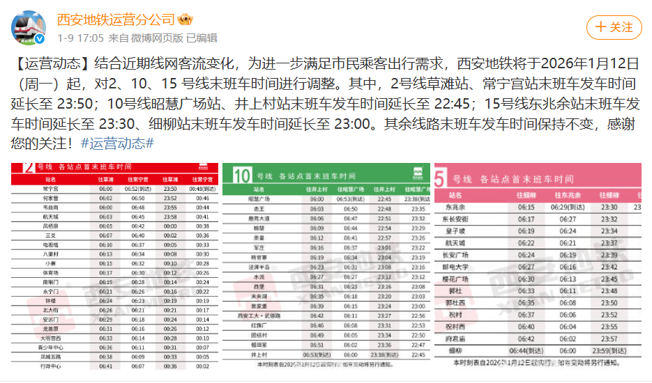 结合近期线网客流变化,为进一步满足市民乘客出行需求,西安地铁将于2026年1月12日(周一)起,对2、10、15号线末班车时间进行调整。
