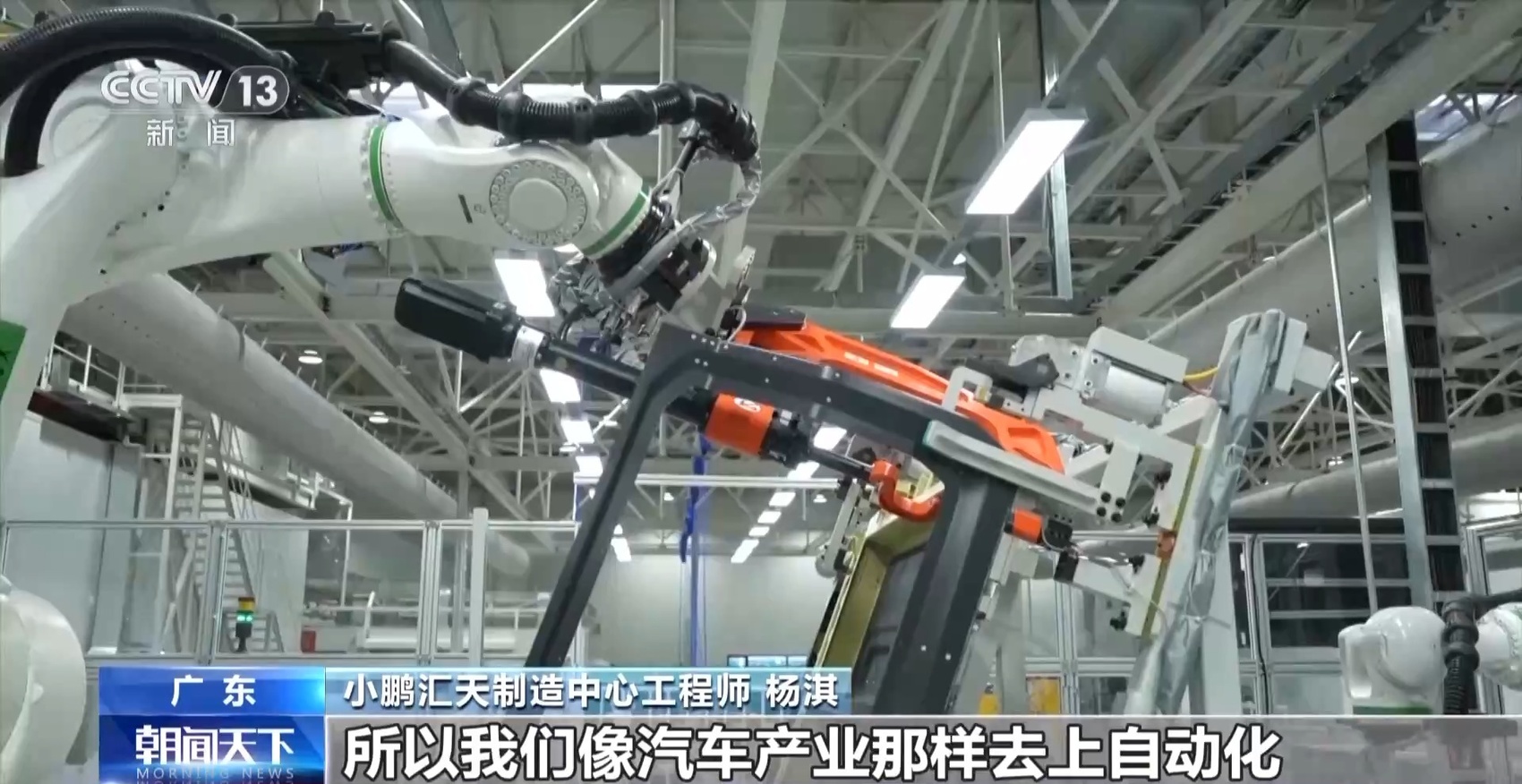 小鹏汇天制造中心工程师 杨淇:因为我们一年要干一万架,每半个小时就要交付一架飞机。在这个生产效率的现实需要之下,所以我们像汽车产业那样去上自动化,就成了一个必然的选择。