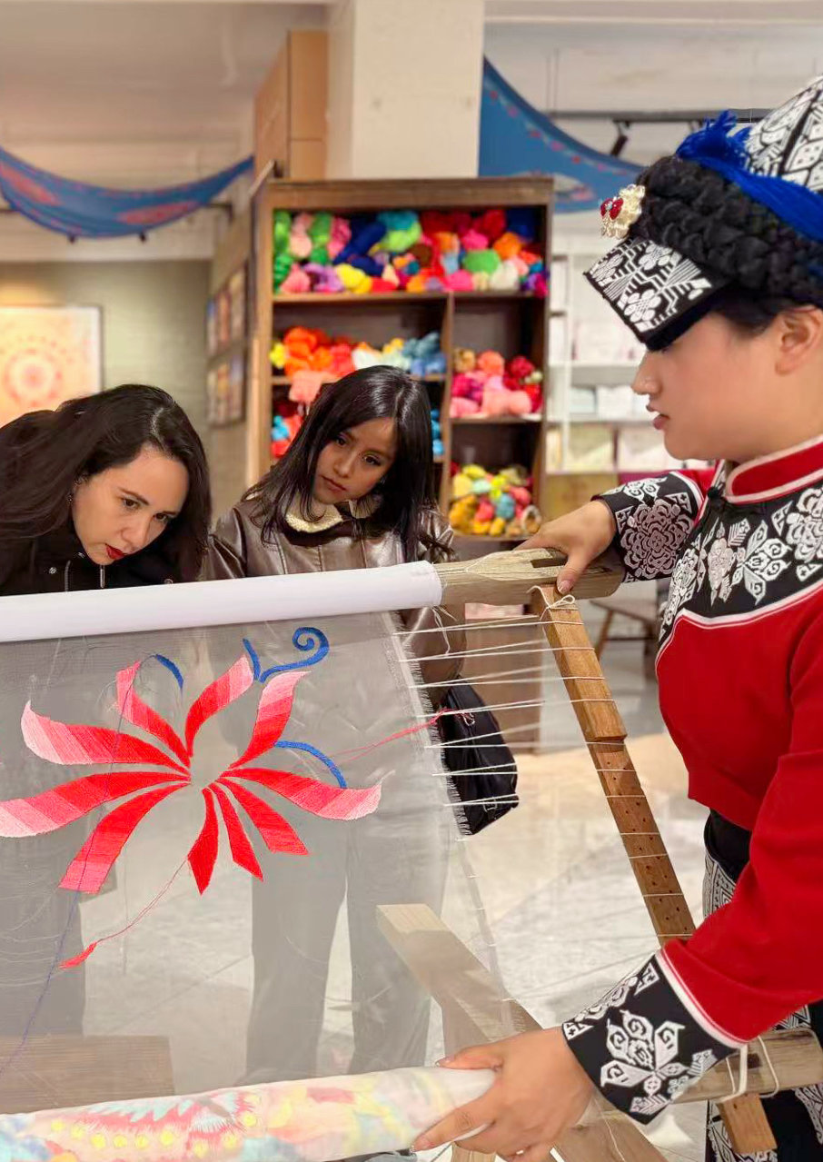在当地向导的带领下,他们来到了一家羌绣非遗工坊。工坊内,几位羌族妇女正围坐在一起,飞针走线,她们面前的绷架上,五彩的丝线在白色的底料上逐渐勾勒出象征吉祥的羊角花。