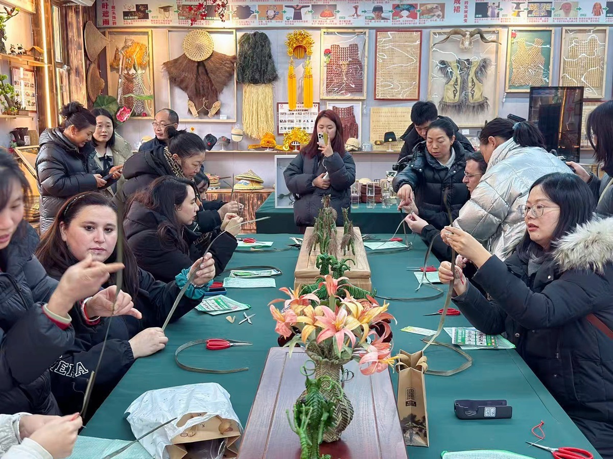 紧接着,青年文学翻译家们又走进了相隔不远的羌族草编工坊,看着陈列的用棕榈叶编出来的龙、蛇、马、蚂蚱等作品,他们不禁拿出手机拍照留念。看到他们如此感兴趣,羌族草编省级非遗代表性传承人黄强便拿出棕榈叶,热情邀请大家进行尝试。在黄强的耐心指导下,大家拿起棕榈叶,小心翼翼地折叠、穿梭着。整个工坊内充满了欢声笑语,不同语言的交流、专注的神情与棕榈叶的清香交织在一起。不一会儿,一个个小蚂蚱就在他们的手中诞生了。