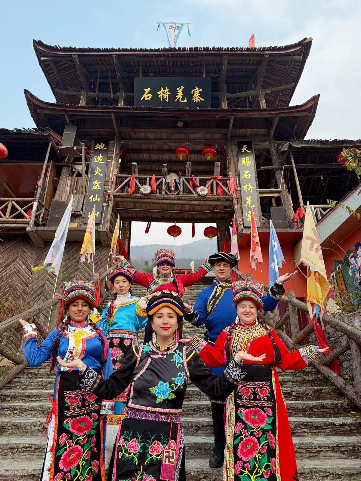 刚下车,青年文学翻译家们就被北川巴拿恰街头的碉楼吸引了目光,羌族特有的羊角图腾和挑梁,让他们赞叹。走在石板路上,两侧商铺林立,身着羌族服饰的当地居民热情地向他们挥手致意,五彩斑斓的刺绣图案在服饰上栩栩如生,展现出羌族人民精湛的手工技艺和对生活的热爱。
