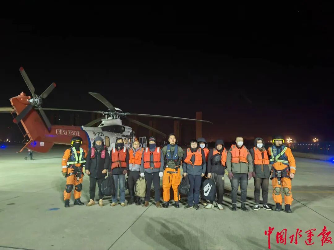 “B-7125”机组人员密切协同,飞行员在暗夜环境中仅凭仪表、夜视仪和搜索灯,在强风中操纵直升机稳定悬停于遇险船舶上空;绞车手紧盯救生员作业状态精准操纵机载绞车设备,救生员克服强风扰动、吊运空间狭小和船舶大幅摇摆等困难,快速降落于甲板。遇险船员因身处险境情绪激动,增加了机组作业难度。现场用时约20分钟,机组经过9次甲板吊运作业,顺利将9名船员转移至机舱。两架直升机随即返航,降落于山东烟台蓬莱沙河口机场。目前,9名船员状态良好。