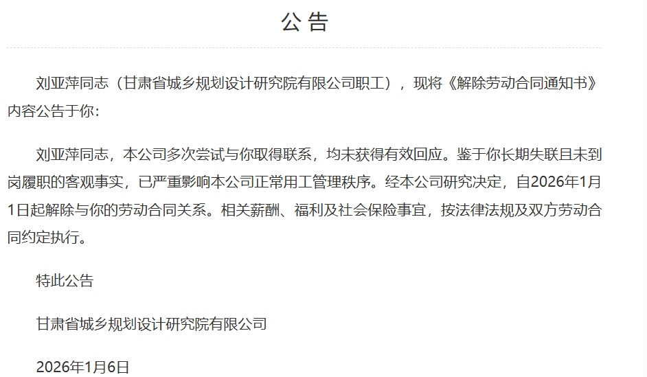 刘亚萍同志(甘肃省城乡规划设计研究院有限公司职工),现将《解除劳动合同通知书》内容公告于你:刘某某同志,本公司多次尝试与你取得联系,均未获得有效回应。鉴于你长期失联且未到岗履职的客观事实,已严重影响本公司正常用工管理秩序。经本公司研究决定,自2026年1月1日起解除与你的劳动合同关系。相关薪酬、福利及社会保险事宜,按法律法规及双方劳动合同约定执行。