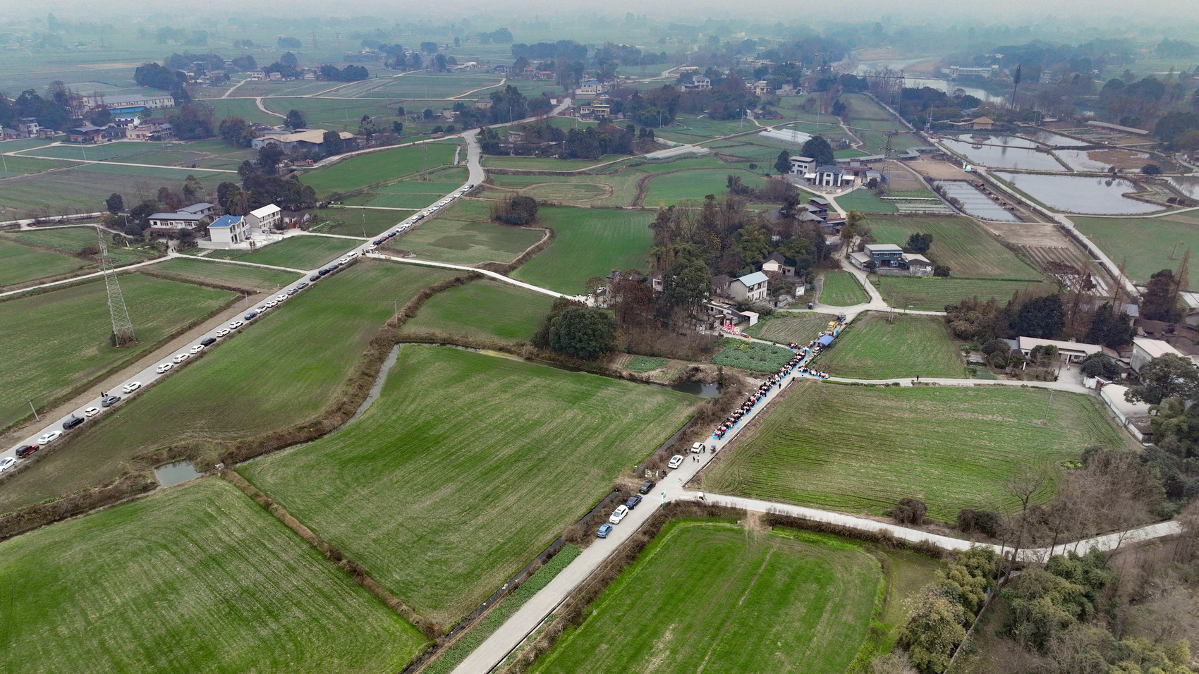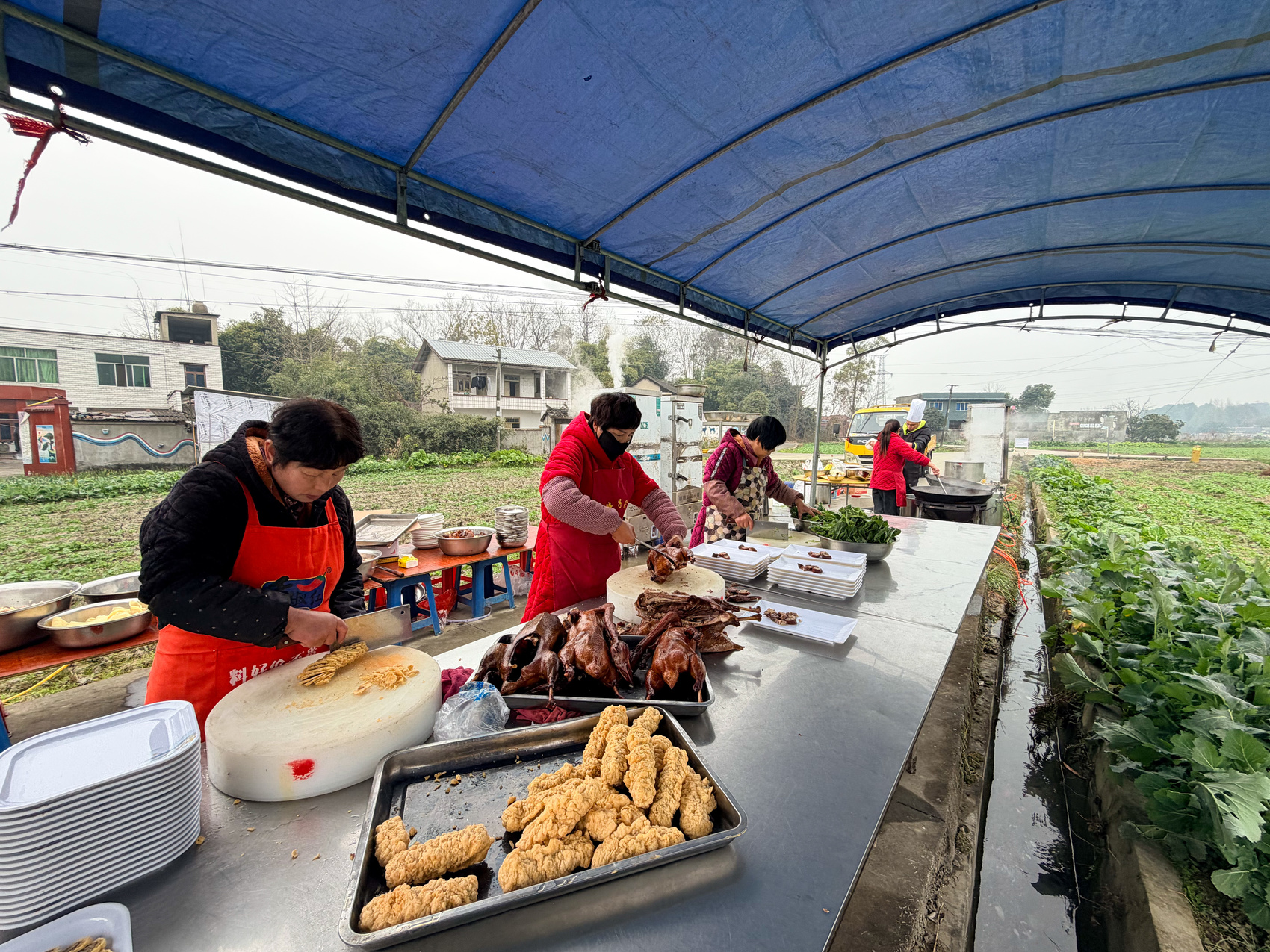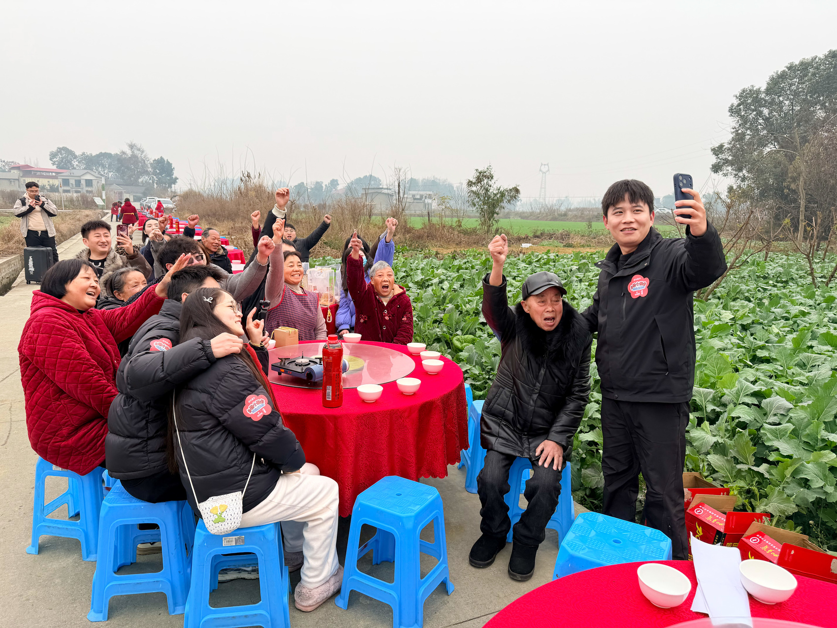 1月11日中午,成都市新都区清流镇水梨村,乡村博主“大森子”林志鹏在家门口举办了一场特别的坝坝宴。乡间小道上,两侧是绿油油的蔬菜,中间是铺着红色桌布的一溜圆桌。100多位年轻网友和100多位村里的老年人,围坐在圆桌前,吃团年饭,迎接新年。