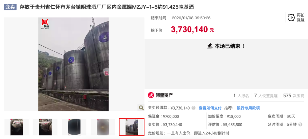 红星资本局1月11日消息,近日,贵州省仁怀市茅台镇明珠酒厂厂区内存放的约91.425吨基酒,上架阿里司法拍卖平台进行拍卖,评估价约548万元,起拍价约373万元。只有一人报名,最终以底价竞得,低于评估价175万元,折算单价仅20元/斤。