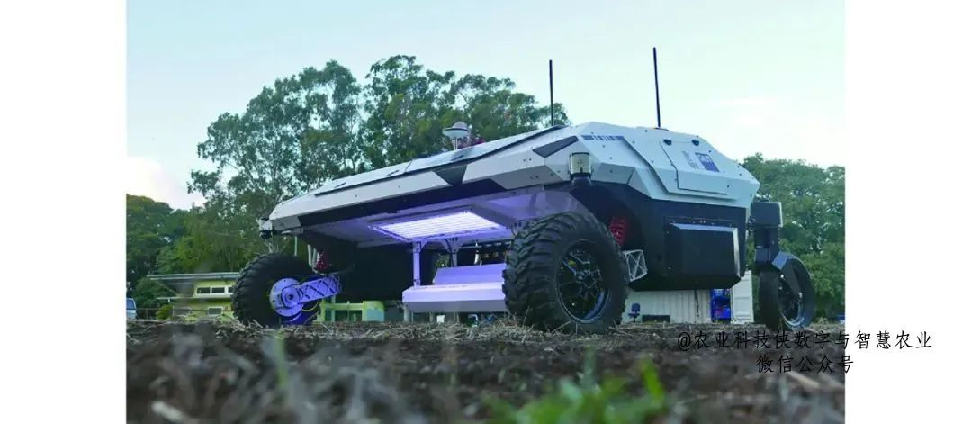 田间管理类机器人是指通过自主导航、视觉识别与定位和精准作业控制技术完成除草、喷药、追肥等功能的机器人,主要针对病虫草害实现精准对靶施药,针对作物生理需求实现按需变量追肥,提高农药和肥料利用率,提高农产品品质,减少生产成本,改善生态环境。它的主要技术难点在于作物杂草高精度实时识别、精准对靶作业等。澳大利亚昆士兰科技大学的MCCOOL等人研发了新一代作物和杂草管理机器人AgBot II(图5),以机器人团队协作方式在田间自主导航、施肥、除草,杂草检测和分类识别成功率在90%以上。