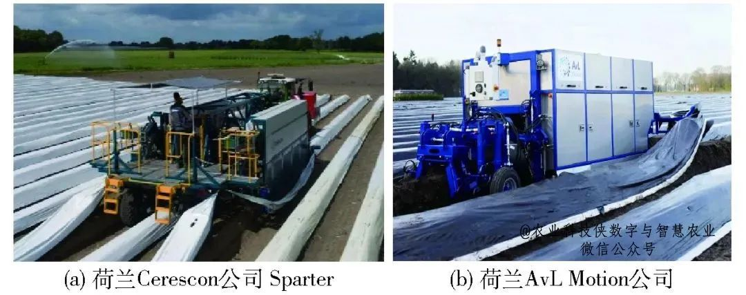 荷兰Cerescon、AvL Motion公司研发了产品化的白芦笋选择性收获机器人。前者采用了基于介电特性的垄面下芦笋检测,白芦笋收获末端执行器和双臂并行收笋机构等技术,实现了最大采收效率0.3 hm2/h。后者采用光学视觉手段检测出土笋芽,设计了基于回转链循环的多末端执行器,实现了垄上多个白芦笋的入土、切割、柔性夹持和出土集箱过程,每株平均收获时间为1.3 s(图8)。