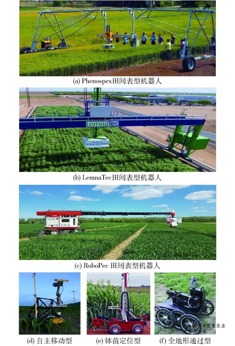 荷兰Phenospex、德国LemnaTec和法国RoboPec公司开发了龙门式和悬臂式植物表型机器人,通过叠加3D和多光谱信息准确测量最大植物高度、3D叶面积、叶片角度、光穿透深度等形态参数,具有高精准度、完全自动化、不受照明条件影响、可实现昼夜扫描等优点,实现了每天10000平方米的高通量分析(图1a~1c)。SHAFIEKHANI、MUELLER-SIM和BAO等人研制了田间移动式作物表型分析机器人,实现了作物茎秆强度及几何形态的高通量测量(图1d、1e)。上海交通大学张伟军等开发了全地形适应性田间作物巡检机器人,采用8轮错位构型与主被动复合柔性驱控算法,保障了行进过程中机载激光传感器和鱼眼相机图像获取的稳定性(图1f)。