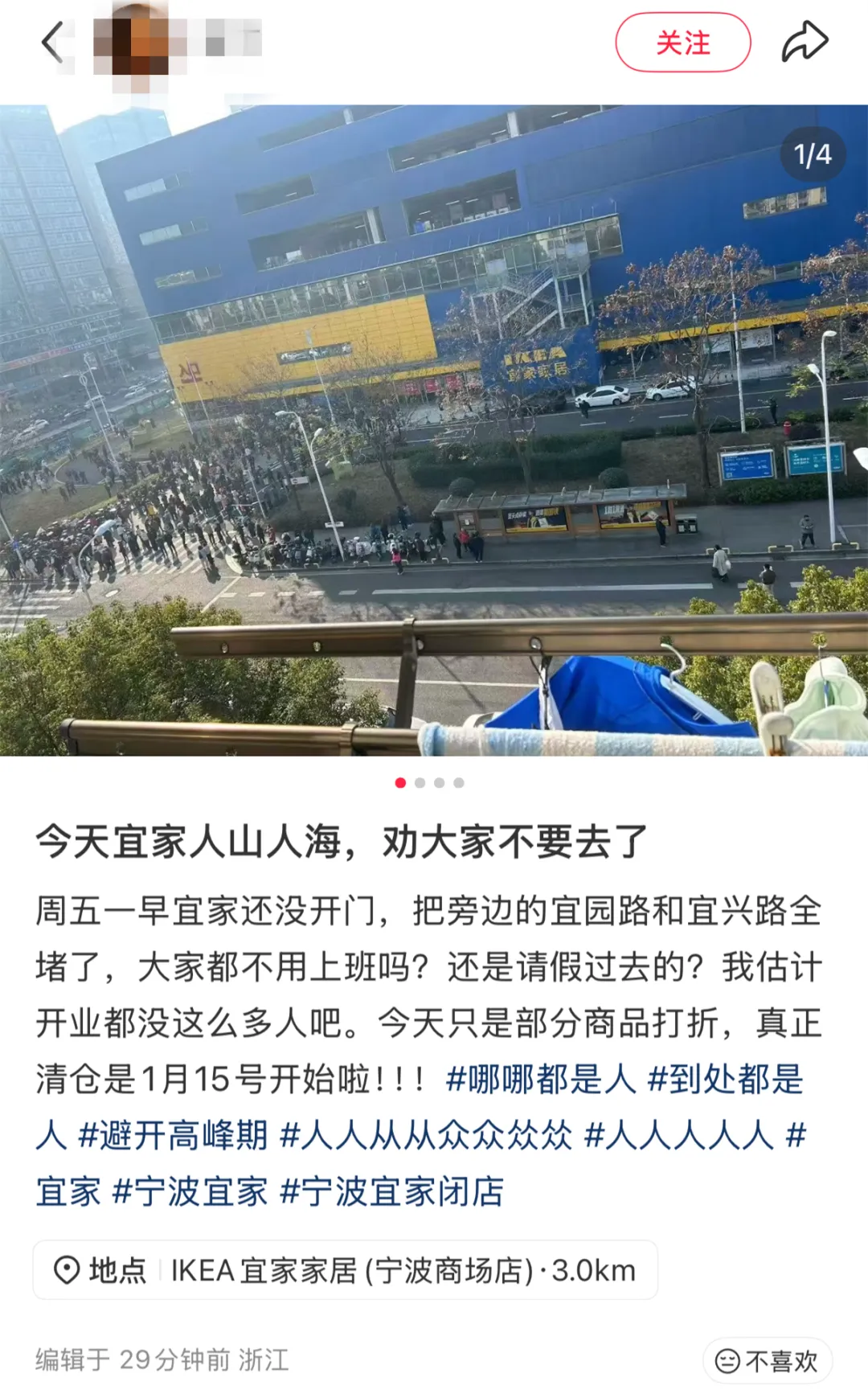 有网友在社交平台发文劝大家先别去,“1月9日只是部分商品打折,真正清仓是1月15日开始!”