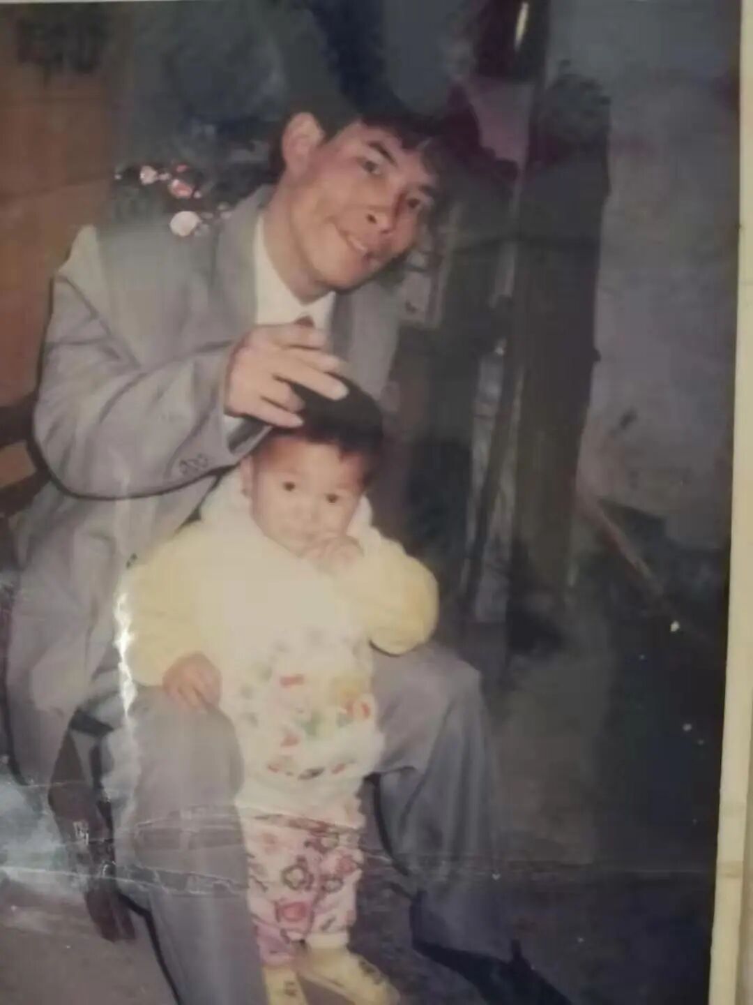1998年春节,钟展峰与外甥女的合照。这是他唯一一次穿西装的照片。受访者供图
