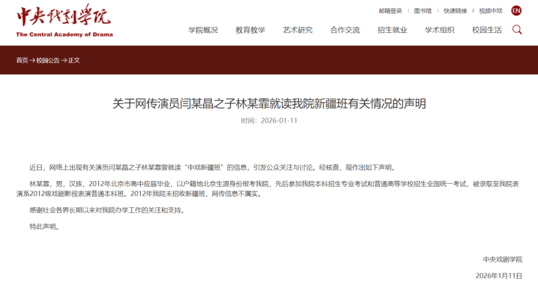 近日,网络上出现有关演员闫某晶之子林某霏曾就读“中戏新疆班”的信息,引发公众关注与讨论。经核查,现作出如下声明。