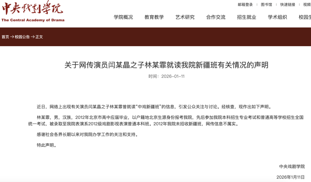 1月11日,中央戏剧学院发布《关于网传演员闫某晶之子林某霏就读我院新疆班有关情况的声明》:
