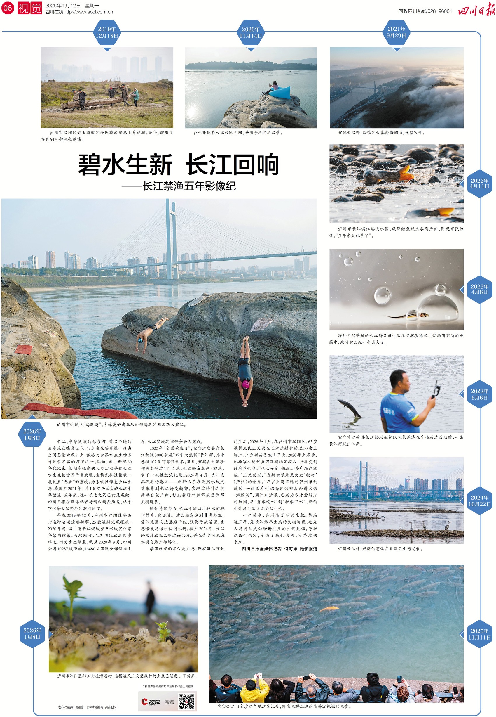 请移步6版,透过《碧水生新 长江回响》的影像,您将看到“水中大熊猫”长江鲟自然繁殖诞生、健康成长的首批鱼苗的珍贵画面,目睹退捕渔民王天荣亲手栽种的土豆发出的新芽,感受“海豚湾”重现的清澈与活力。每一帧,都是长江重获生机的瞬间。