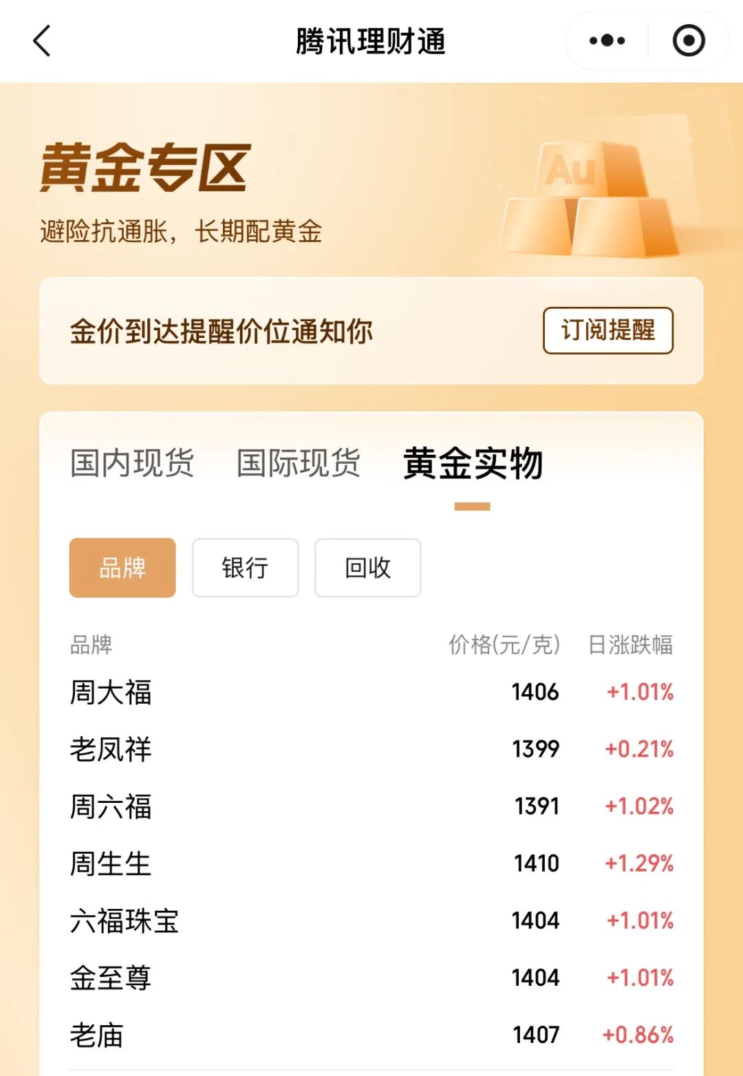 截至发稿,据腾讯理财通数据,多家黄金珠宝品牌公布的境内足金首饰价格延续近期涨势,部分品牌克价超过1400元。